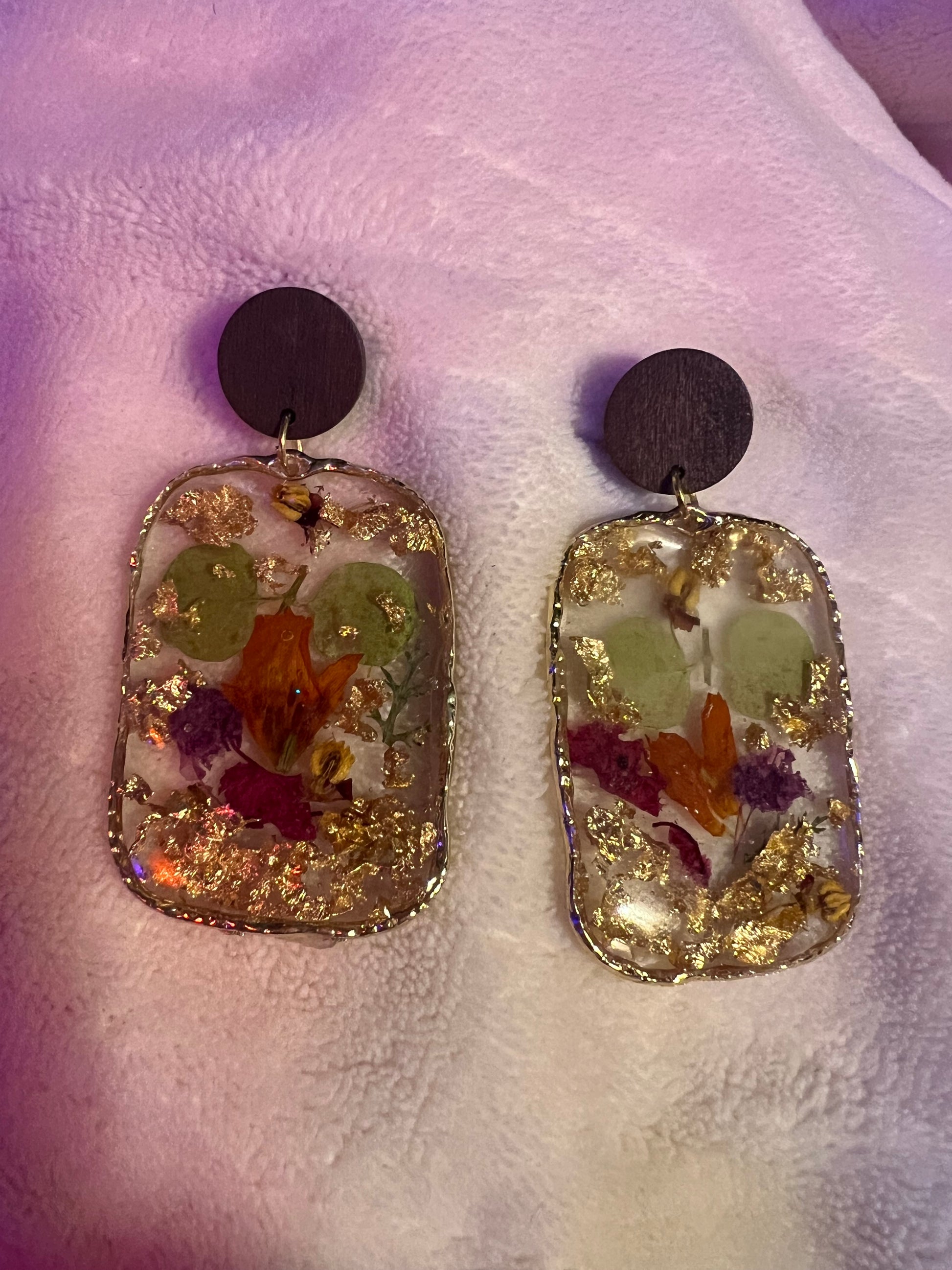 Home grown pressed flowers set in resin in a gold-colored metal frame about 1.5 inches long. Attached to a brown wood stud for a dangle earring effect. Able to recreate but no item will be exactly duplicated. Every item has its own soul. Customizable upon request.
